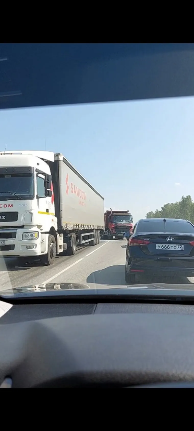- Александр16 июля 2022 12:35На фото причина "затора". Самосвал въехал фуре в зад и раскарячился по всей дороге, под ним какая-то жидкость вытекла. Объехать можно только по одной обочине. Сам там стоял минут 10-15, около 15.00, ехал со стороны Омска, объезжали по левой обочине, пока дорожники держали встречный поток.
