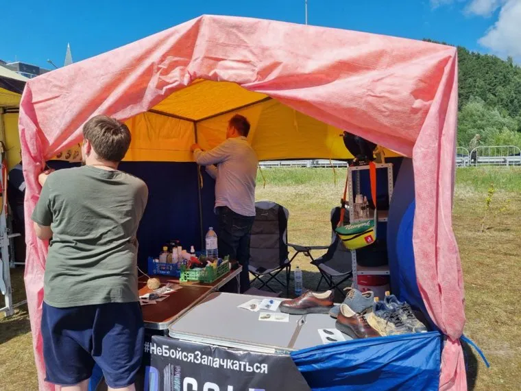 «Во время подготовки к мероприятию к нам подошли организаторы и потребовали чем-то закрыть палатку. Нам объяснили, что просят это сделать из-за сходства с флагом Украины. Это была стандартная ярморочная палатка, такие всегда стояли в городе. При этом даже порядок цветов на палатке отличался от порядка на флаге», — сказал один из участников.