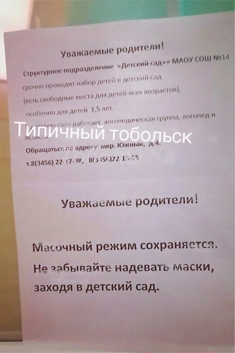 «Уважаемые родители! Масочный режим сохраняется. Не забывайте надевать маски, заходя в детский сад», — фото такого объявления жители разместили в группе «Типичный Тобольск» в социальной сети «ВКонтакте».