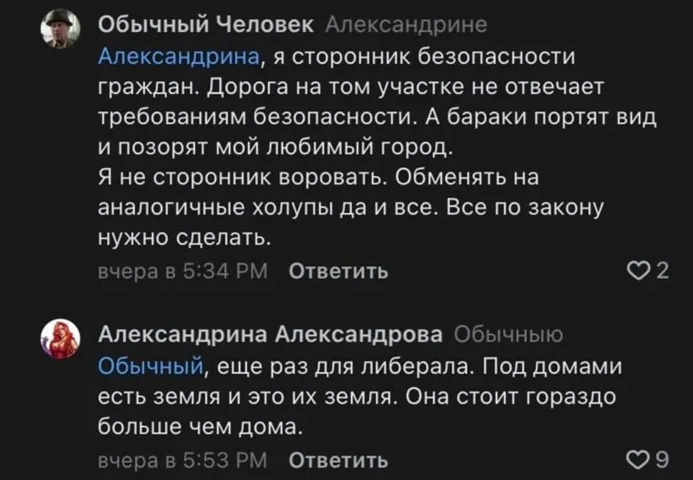 Часть пользователей обрадовалась такой новости, но другие подписчики не согласились с их мнением. «Это не повод, чтобы воровать у этих людей имущество и землю, на которой они прожили много лет. Может, вы сторонник 30-этажных гетто, как в Тюмени строят? Эти граждане могут перестроить свои дома в будущем или продать по рыночной цене и потратить деньги по своему усмотрению», — высказывает противоположное мнение Александрина Александрова.