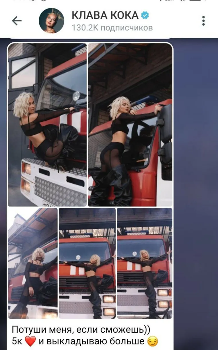 Певица из Екатеринбурга Клава Кока (Клавдия Высокова) устроила жаркую фотосессию на пожарной машине. Она поделилась фото в своих соцсетях.
