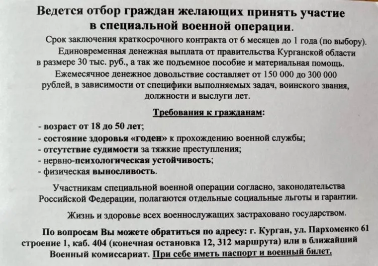 «Ведется отбор граждан, желающих принять участие в специальной военной операции. Ежемесячное денежное довольствие составляет от 150 до 300 тысяч рублей в зависимости от специфики выполняемых задач, воинского звания, должности и выслуги лет. Единовременная денежная выплата от правительства Курганской области в размере 30 тысяч рублей, а также подъемное пособие и материальная помощь», — говорится в письме, опубликованном в группе «Шадринск — часть России» в соцсети «ВКонтакте».