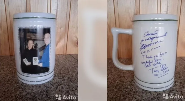 Кружка из пивного ресторана с фотографией и автографами президента России Владимира Путина и бывшего премьер-министра Великобритании Тони Блэра продается в Тюмени. Объявление размещено на сайте «Авито». За раритет просят 10 тысяч рублей.
