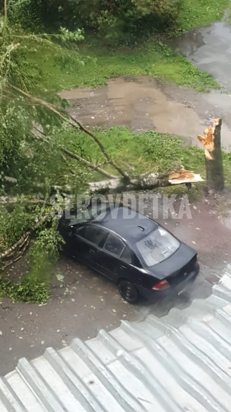 «В Серове сильный ветер и дождь. На фото двор по ул. Ленина, 163. От сильного ветра на припаркованный автомобиль упала береза. Также видно, что от ветра раскачивается береза и ветками цепляет провода у дома 158 по ул. Ленина. Провода искрят», — рассказали подписчики группы «Serovdetka» в соцсети «ВКонтакте».