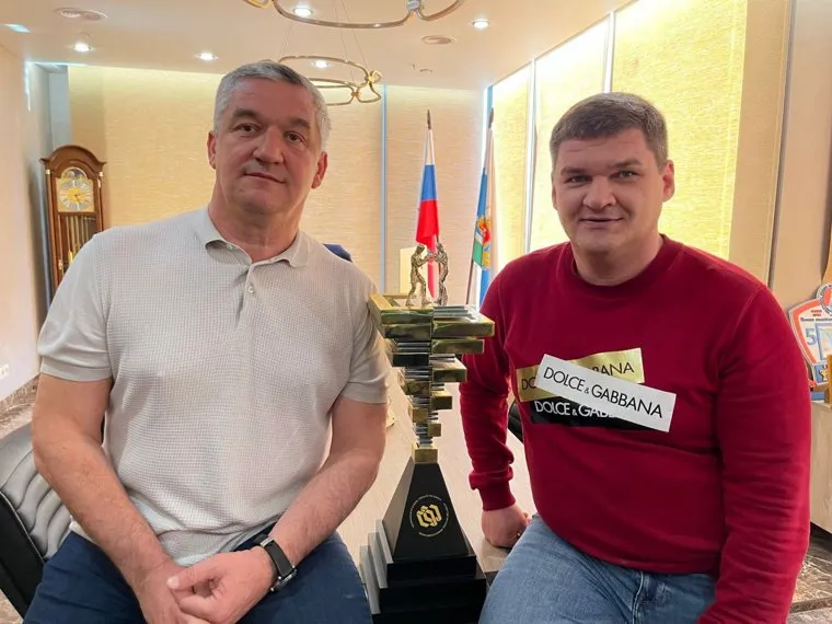На фото: Федор Дудкин — член наблюдательного совета СОФБ (слева) и Михаил Кайгородов — председатель правления СОФБ (справа) с переходящим кубком чемпионов