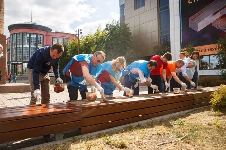 Завершив прогулку по набережной, Алексей Орлов переместился к памятнику Малышеву, где вместе с волонтерами покрасил скамейки