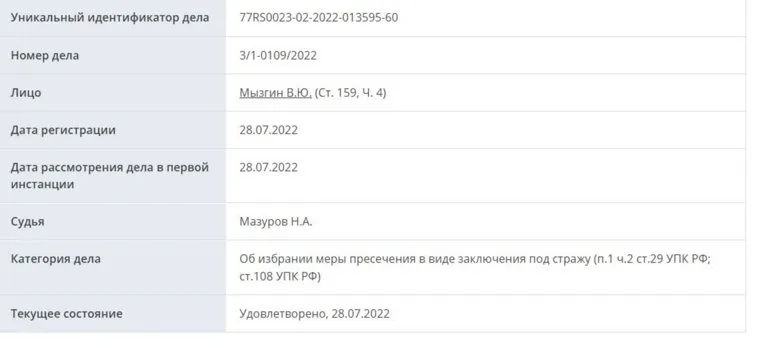 На сайте Савеловского районного суда Москвы официально размещена информация по делу № 3/1-0109/2022. В ней говорится об избрании меры пресечения в виде заключения под стражу с 28 июля Мызгина В.Ю по ч. 4 4 ст. 159 УК РФ (мошенничество в особо крупном размере). В пресс-службе суда на звонок URA.RU не ответили.
