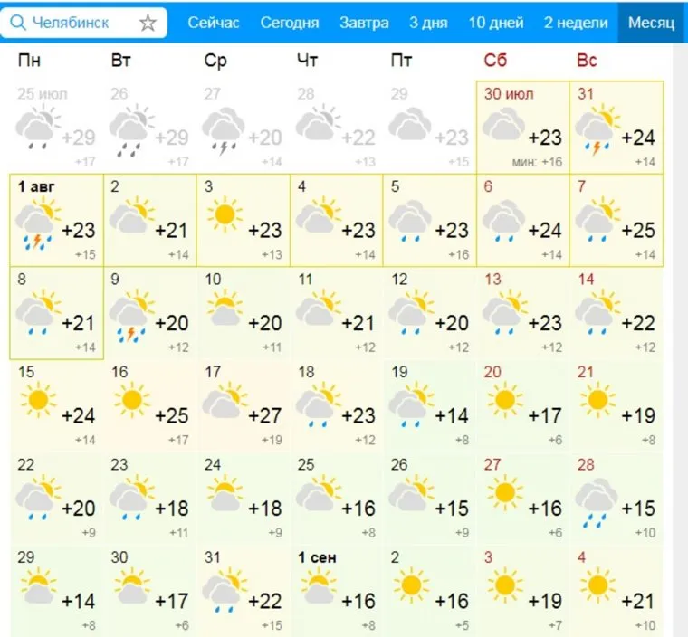 Дождливое лето синоптики обещали жителям Челябинска еще в середине июня. Максимальная прогнозная температура июня подтвердилась — в городе фиксировали до 26 градусов тепла. В июле метеорологи обещали всего +25, однако погода оказалась непредсказуемо переменчивой и жаркой. На август долгосрочные прогнозы разных метеослужб пока сходятся.