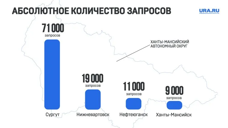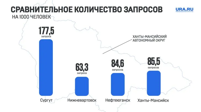 Если же говорить о количестве запросов на 1000 человек населения, то здесь Сургут так же остается на первой строчке — 177,5 запроса, второе место занял Ханты-Мансийск — 85,5 запросов, от него ненамного отстал Нефтеюганск с 84,6 запросами. Замыкает рейтинг — Нижневартовск с 63,3 запросами.