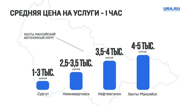 Кроме того, оказалось, что ценник на услуги различается в разных городах. Так, в Ханты-Мансийске самые дорогие проститутки — средняя цена часа — 4-5 тысяч рублей. Далее идет Нефтеюганск — 3,5-4 тыс. за час. Третью строчку занимает Нижневартовск — 2,5-3,5 тыс. И на последнем месте Сургут с самыми дешевыми жрицами любви. В крупнейшем городе ХМАО цены за час начинаются от тысячи рублей.
