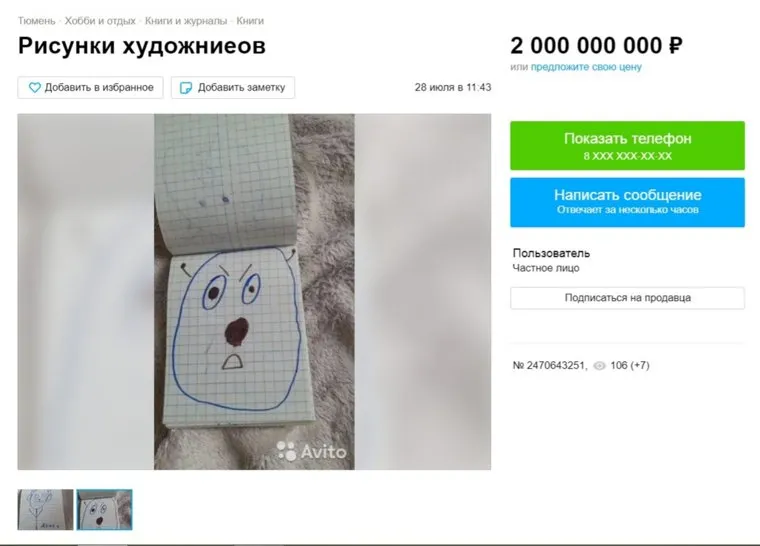 Житель Тюмени продает картины, нарисованные фломастерами, за два миллиарда рублей. Объявление опубликовано на площадке Avito.