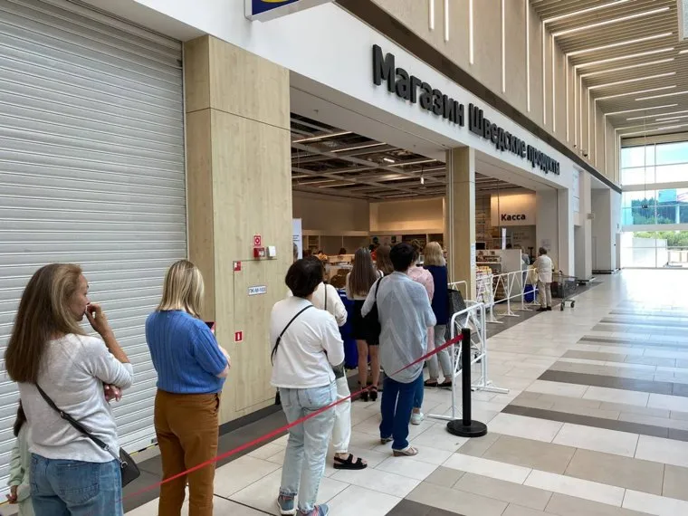 «В „Шведские продукты“ пускают одновременно не более 20 человек. Внутри вместе с едой продают кастрюли и сковородки», — сообщил корреспондент. Напротив магазина встала очередь — в пункт выдачи товаров с сайта IKEA.