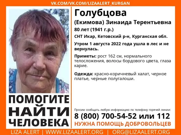 «Пропала Зинаида Терентьевна Голубцова (Екимова), 80 лет (1941 года рождения). СНТ „Икар“, Кетовский округ. Приметы: рост 162 см, нормального телосложения, волосы бордового цвета, карие глаза. Одежда: красно-коричневый халат, черное платье, черные полугалоши», — указано в сообщении.