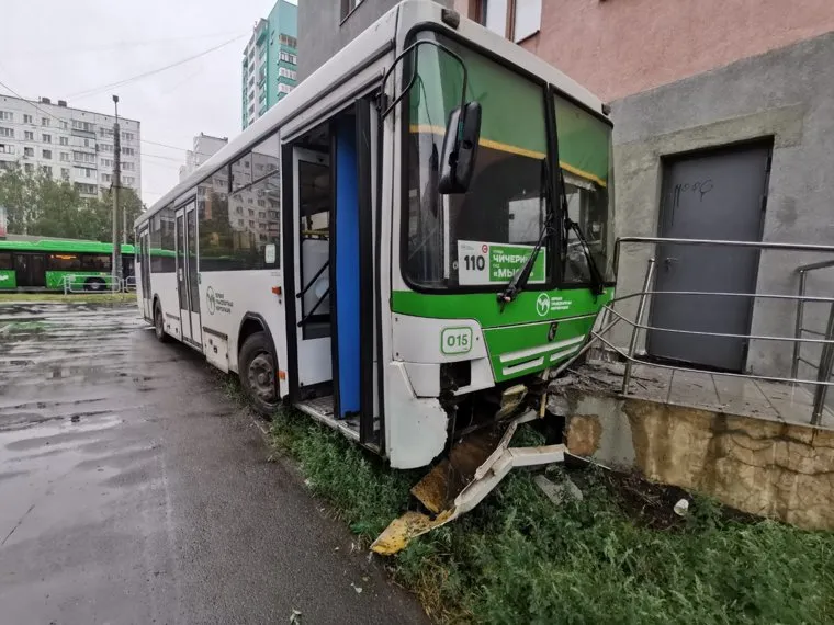 В Челябинске пассажирский автобус после ДТП врезался в отель. Видео, фото