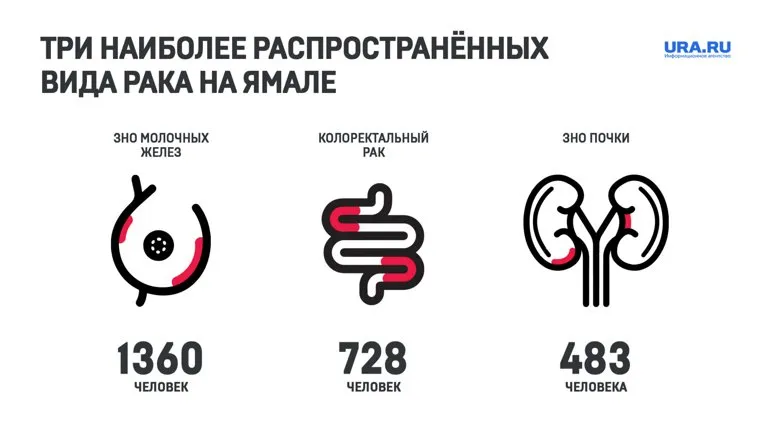 Онкологи департамента здравоохранения выявили три наиболее распространенных вида рака на Ямале. Так, на первом месте по заболеваемости находится ЗНО [злокачественное новообразование] молочных желез — 1360 человек, на втором месте колоректальный рак — 728 человек, на третьем месте — ЗНО почки — 483 человека.