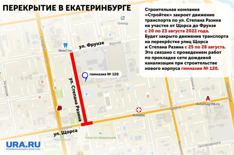 «Строительная компания „Стройтек“ закроет движение транспорта по улице Степана Разина на участке от Щорса до Фрунзе с 20 по 23 августа 2022 года. В период с 25 по 28 августа будет закрыто движение транспорта на перекрестке улиц Щорса и Степана Разина. Это связано с проведением работ по прокладке сети дождевой канализации при строительстве нового корпуса гимназии № 120», — сказано в сообщении.