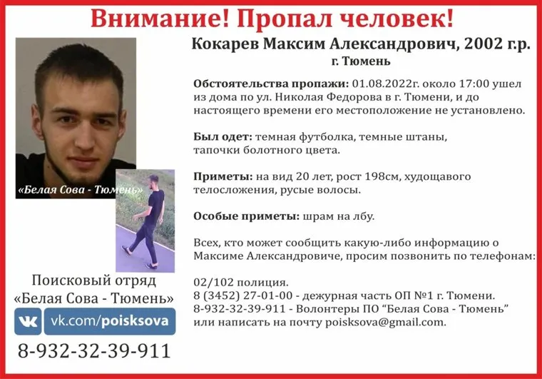 «Кокарев Максим Александрович, 2002 г. р. 1 августа около 17:00 ушел из дома по ул. Николая Федорова. До настоящего времени его местоположение не установлено», — говорится в ориентировке.