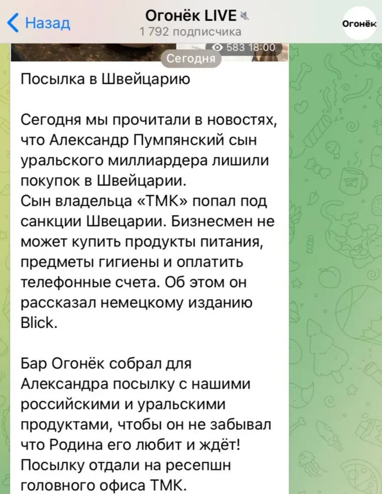 «Мы прочитали в новостях, что Александра Пумпянского, сына уральского миллиардера, лишили покупок в Швейцарии. Бизнесмен не может купить продукты питания, предметы гигиены и оплатить телефонные счета. Бар «Огонек» собрал для Александра посылку с нашими российскими и уральскими продуктами, чтобы он не забывал, что Родина его любит и ждет! Посылку отдали на ресепшен головного офиса «ТМК», — говорится в сообщении.