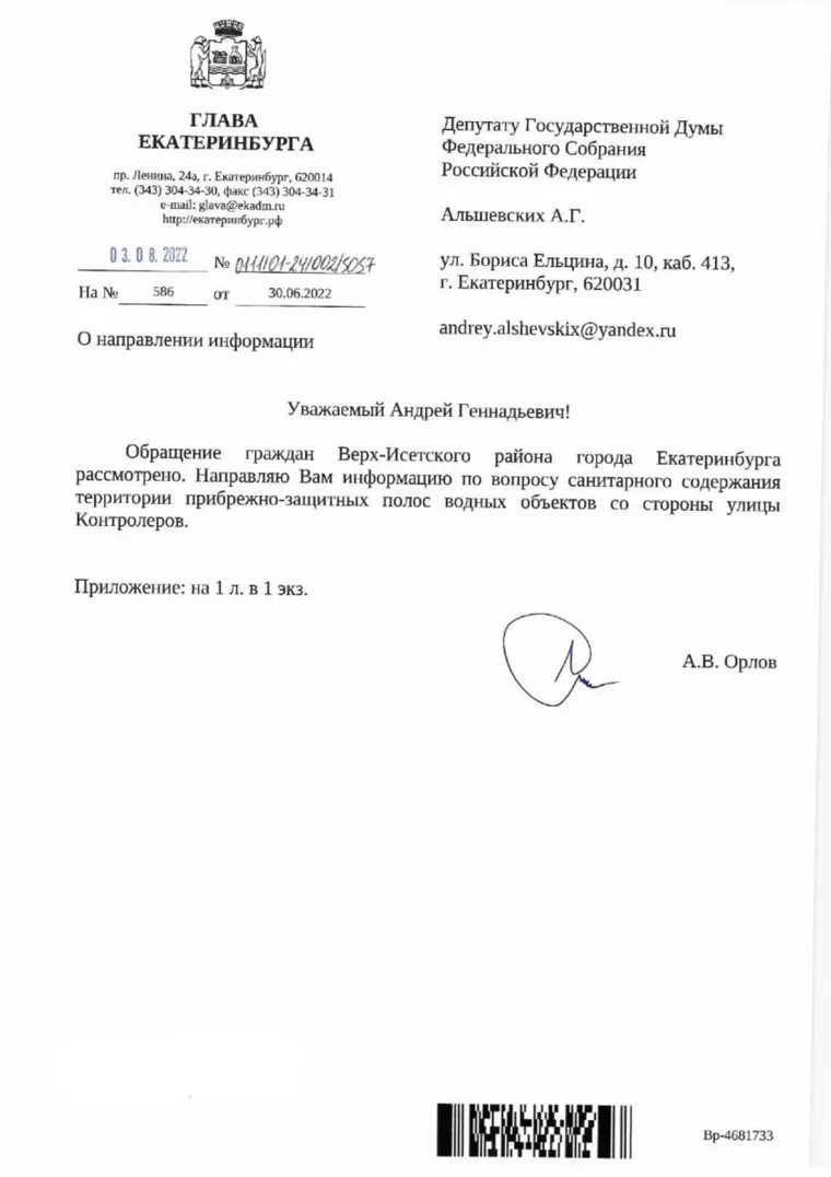 По словам Альшевских, в начале июля он попросил чиновников выяснить, почему пляж со стороны Электродепо находится в ужасном состоянии. А 3 августа ему пришел ответ от мэра Алексея Орлова, к которому был прикреплен развернутый комментарий Бубнова.