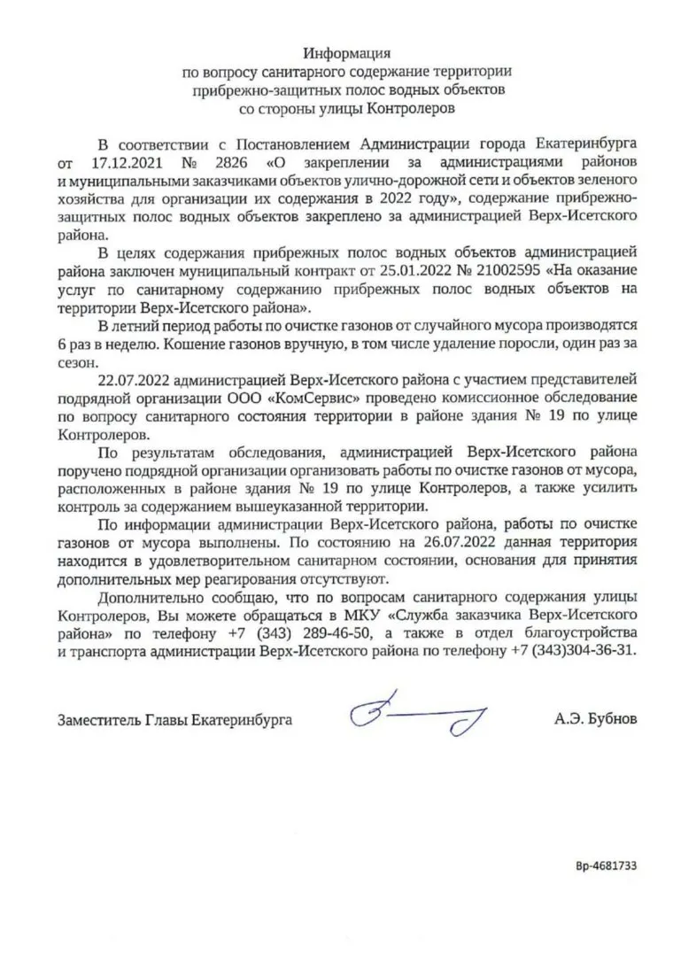 В нем говорится, что по контракту с администрацией Верх-Исетского района подрядчик должен прибираться на территории шесть раз в неделю. Выехав на место 22 июля, чиновники поручили бизнесменам убрать мусор с газонов возле здания на ул. Контролеров, 19. «По состоянию на 26 июля данная территория находится в удовлетворительном санитарном состоянии, основания для принятия дополнительных мер реагирования отсутствуют», — сказано в документе.