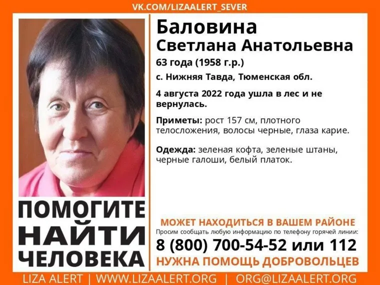 «Внимание! Пропала Баловина Светлана Анатольевна, 63 года. Село Нижняя Тавда, Тюменская область. 4 августа 2022 года ушла в лес и не вернулась», — говорится в сообщении поискового отряда.