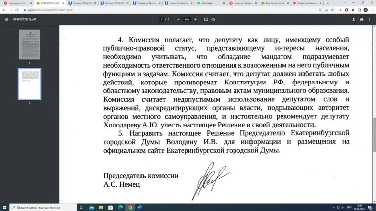 «Действия Холодарева А. Ю. дискредитируют органы власти, подрывают доверие к деятельности Екатеринбургской городской думы. [Они] не соответствуют морально-этическому облику депутата. <…> Комиссия считает недопустимым использование депутатом слов и выражений, дискредитирующих органы власти, подрывающих авторитет органов местного самоуправления, и настоятельно рекомендует депутату Холодареву А. Ю. учесть настоящее решение в своей деятельности», — говорится в решении комиссии, опубликованном на сайте думы.