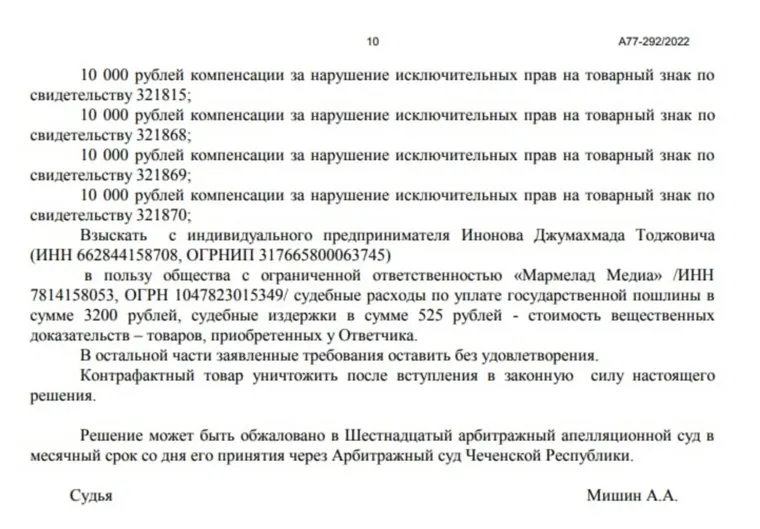 «Взыскать с индивидуального предпринимателя Инонова Джумахмада в пользу ООО „Мармелад Медиа“ (общество из Санкт-Петербурга, которому принадлежат авторские права, — прим.ред) по 10 000 рублей за нарушение исключительных прав на товарные знаки: „Ежик“, „Крош“, „Нюша“, „Бараш“, „Копатыч“, „Кар-Карыч“, „Совунья“, „Лосяш“. Контрафактный товар уничтожить после вступления в законную силу настоящего решения», — сказано в документе.