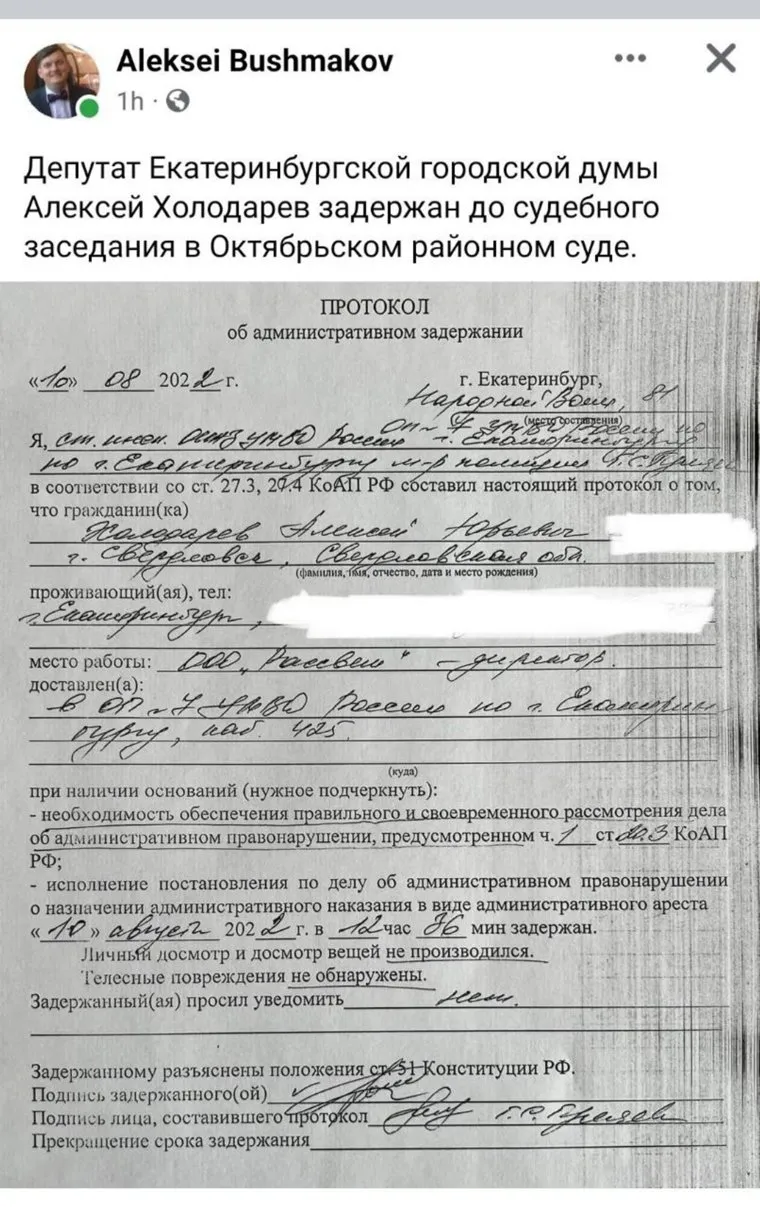 «Депутат Екатеринбургской городской думы Алексей Холодарев задержан до судебного заседания в Октябрьском районном суде», — написал он в соцсетях. К посту также было прикреплено фото протокола об административном задержании.