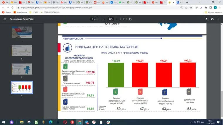 «Потребительские цены в июле 2022 года к декабрю 2021 года снизились на автомобильный бензин АИ-95 (99,63%) и АИ-92 (98,65%). В июле стоимость АИ-95 в регионе составила 47,31 рублей за литр, АИ-92 — 43,48 рублей за литр», — отметили в Челябинскстате.