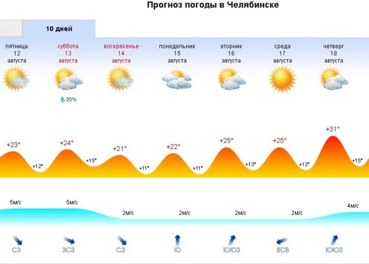 С 12 августа температура в Челябинске понизится до 24 градусов. К воскресенью, 14 августа, столбик термометра не поднимется выше 21 градуса. Рабочая неделя начнется с 22 градусов, после чего два дня подряд — 16, 17 и 18 августа — в столице Южного Урала ожидается 25 градусов. После этого относительное похолодание закончится. Синоптики предсказывают, что 19 августа температурные показатели вновь вернутся к 30-градусной отметке.