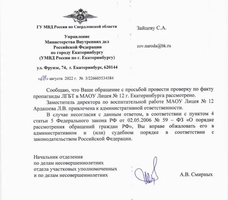 Сергею Зайцеву поступил ответ из полиции о результатах проверки лицея