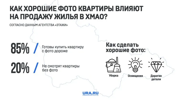 Жители ХМАО чаще покупают квартиры, в объявлении о продаже которых опубликованы качественные фотографии или видео. Риэлторы считают, что подобное жилье продается в два раза быстрее. Исследование для URA.RU провела компания «Этажи».