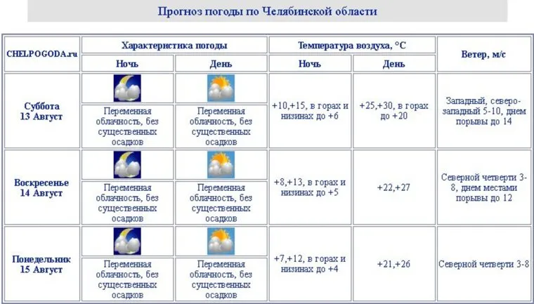 По остальным территориям Челябинской области ночи будут прохладными, но не более: 10—15 градусов. В столице региона также не ожидается ничего необычного: 9—14 градусов ночью и 23—27 градусов днем, без осадков. Такая же погода прогнозируется и по всему Южному Уралу. Возвращение аномальной жары синоптики обещают челябинцам с 19 августа.