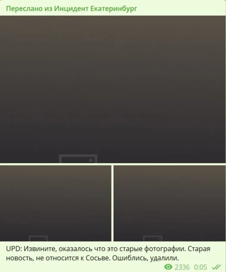 Вскоре новость опубликовали в паблике «Инцидент Екатеринбург», но через полчаса удалили. «Извините, оказалось что это старые фотографии. Старая новость, не относится к Сосьве. Ошиблись, удалили», — сообщили в telegram-канале. В комментариях к посту пользователи подтверждают, что фотографии относятся к другим случаям.