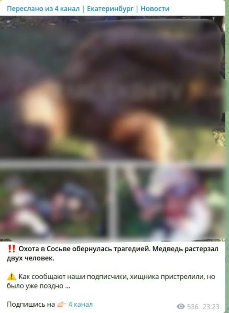 «Охота в Сосьве обернулась трагедией. Медведь растерзал двух человек. Как сообщают наши подписчики, хищника пристрелили, но было уже поздно», — сообщил в telegram-канале «Четвертый канал». К посту были прикреплены несколько фотографий — застреленного медведя и двух погибших.