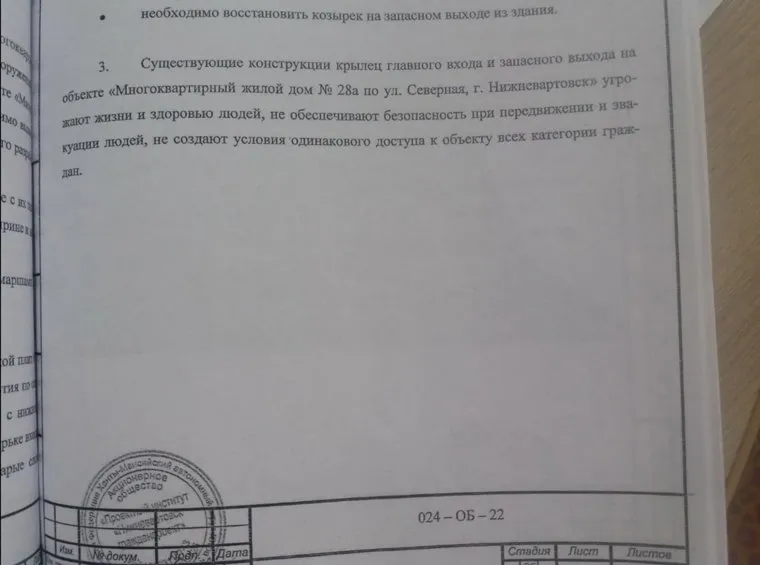 Как сообщается в социальной сети, жильцы провели экспертизу крыльца. Заключение экспертизы подтвердило наличие угрозы жизни и здоровью жителей и гостей дома.