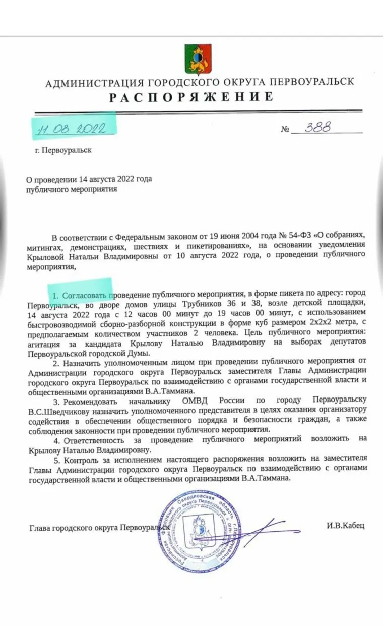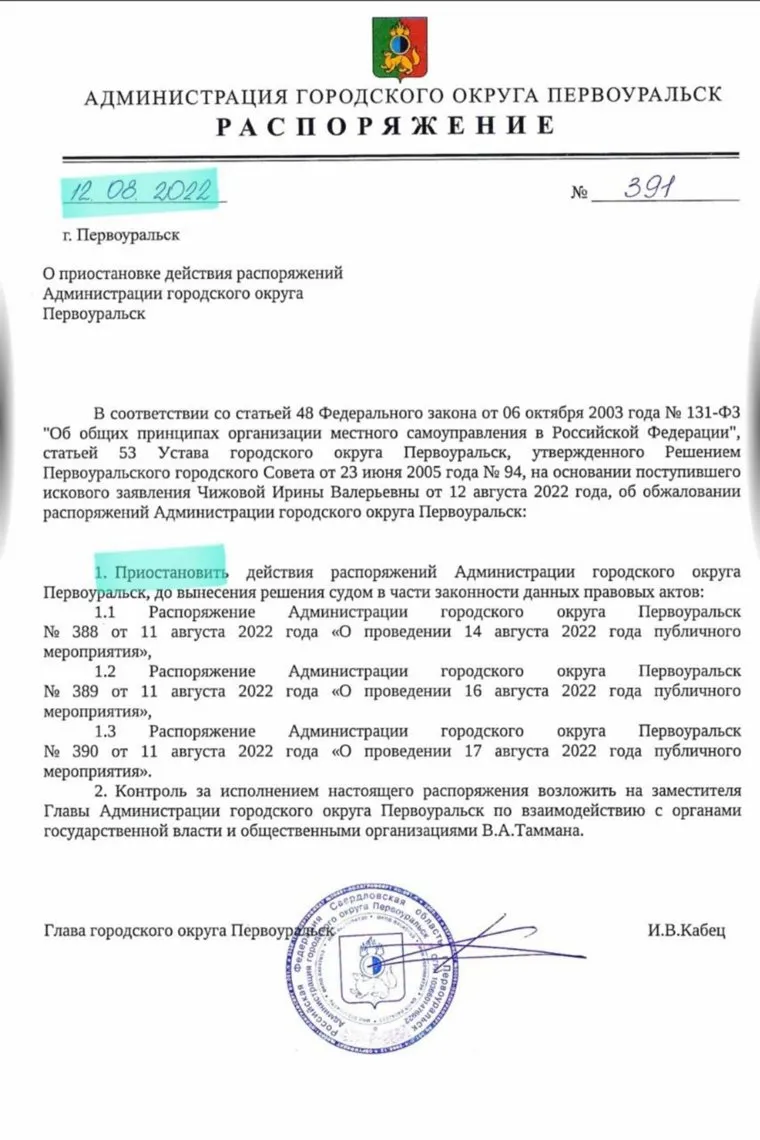 «На основании поступившего искового заявления об обжаловании распоряжения Администрации Первоуральска приостановить до выяснения решения судом в части законности данных правовых актов», — следует из документа, подписанного 12 августа. Днем ранее мэрия согласовала пикет митинг Крыловой, который должен был пройти 14 августа.
