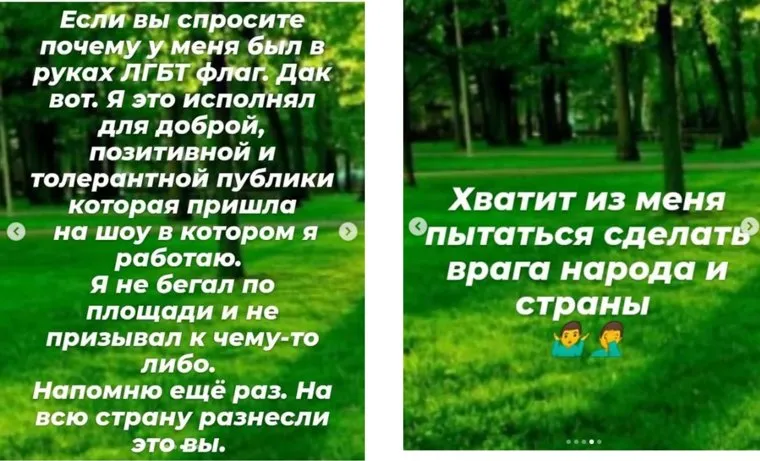 Также травести-артист пояснил, что держал флаг ЛГБТ* во время исполнения гимна РФ, потому что в клубе была добрая, позитивная и толерантная публика, которая знала, куда пришла. В конце поста он добавил, что будет рад видеть на своих выступлениях всех, независимо от сексуальных предпочтений.