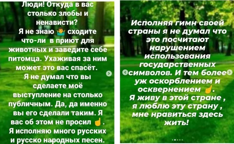 «Исполняя гимн своей страны, я не думал, что его посчитают нарушением использования государственных символов. И тем более оскорблением и осквернением. Я живу в этой стране, я люблю эту страну, мне нравится жить здесь […] Хватит из меня пытаться сделать врага народа и страны», — написал Нечаев у себя в Instagram (соцсеть признана экстремистской, деятельность запрещена на территории РФ).