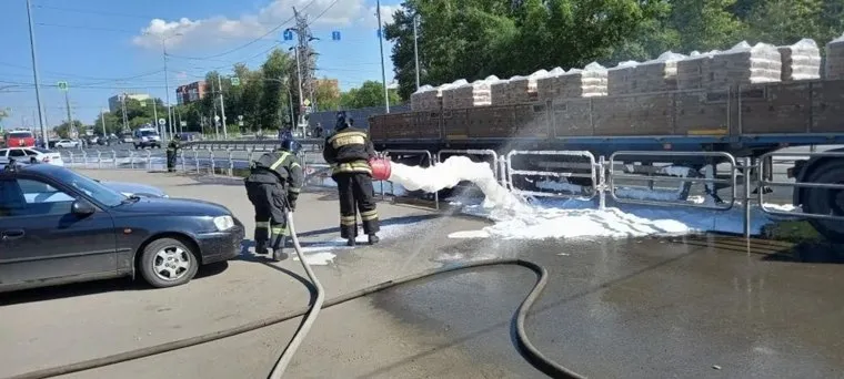 Спасатели заливают проезжу. часть пеной, чтобы бензин не вспыхнул