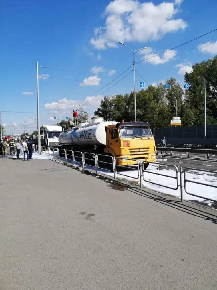 Дорогу у челябинской ГИБДД заливает бензином из разбитой цистерны. Фото