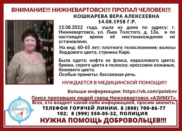 «15 августа рано утром ушла из дома и по настоящее время ее местонахождение не известно. Была одета в кофту из флиса кораллового цвета, серые брюки в полоску и кожаные кроссовки. Из особых примет указывают бессвязную речь», — уточняется в группе поискового отряда «Азимут».