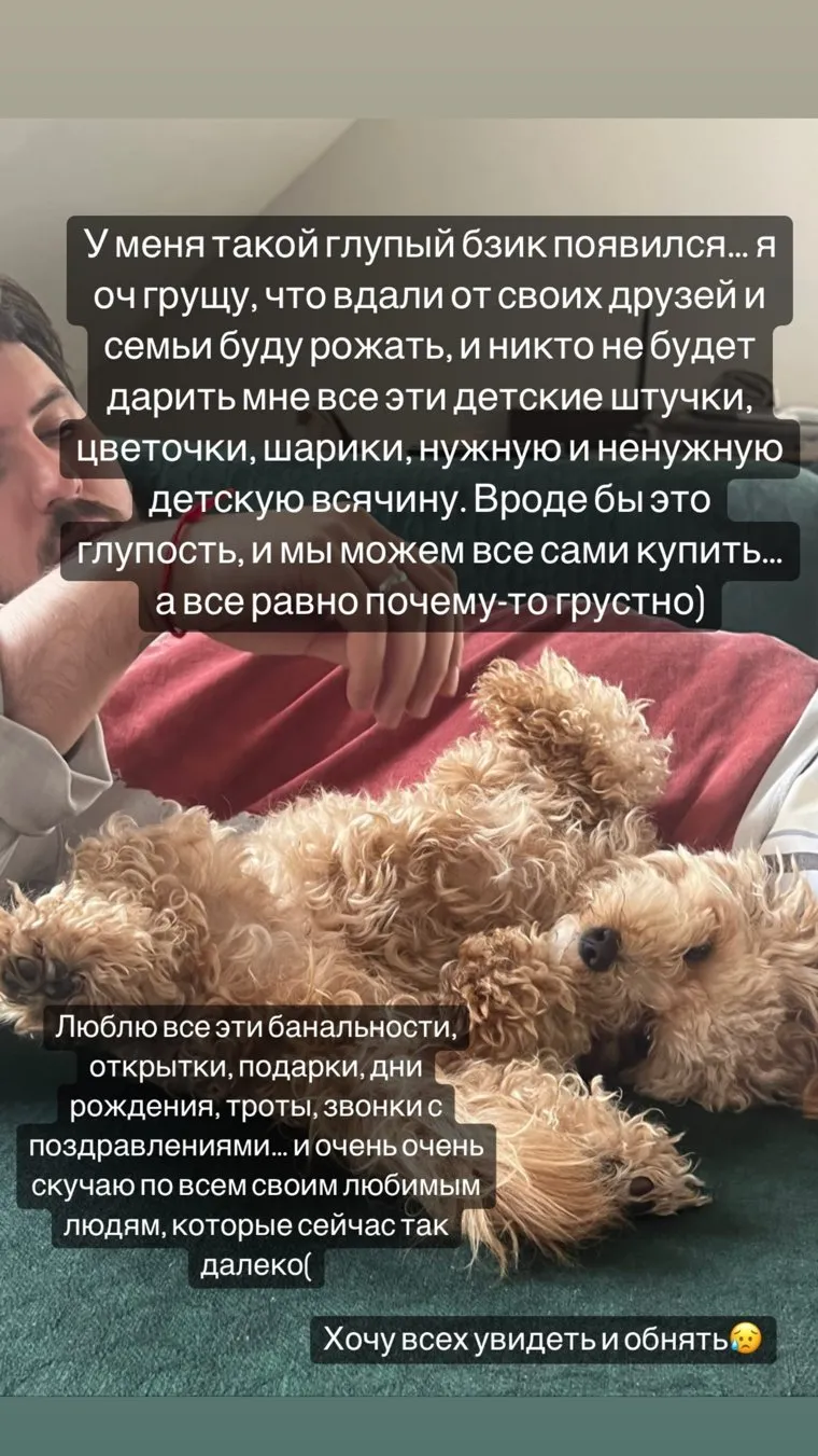 «У меня такой глупый бзик появился… Я очень грущу, что вдали от своих друзей и семьи буду рожать, и никто не будет дарить мне все эти детские штучки, цветочки, шарики, нужную и ненужную детскую всячину. Вроде бы это глупость, и мы можем все сами купить», — написала певица. Но подчеркнула, что ей все равно грустно.