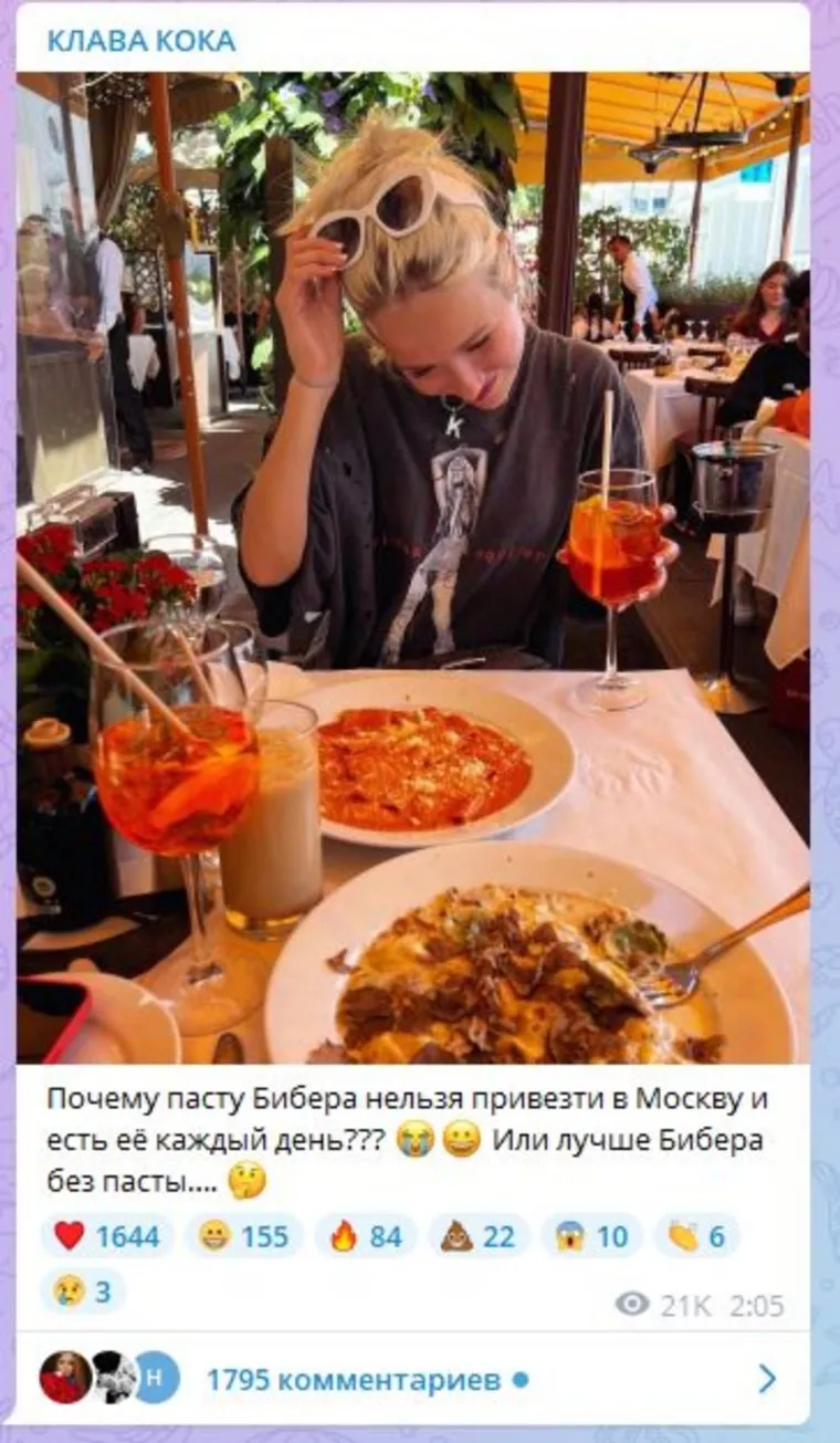 Певица из Екатеринбурга Клава Кока (настоящее имя Клавдия Высокова) с огорчением отметила, что не может забрать с собой пасту под названием «Бибер», которая так понравилась ей во время отпуска. Об этом она написала в своем telegram-канале.