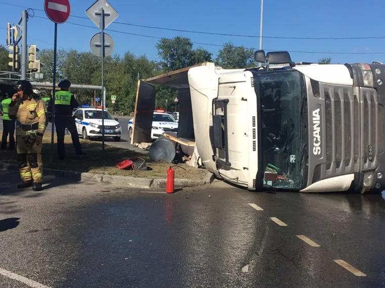 Грузовик перевернулся и блокировал главную магистраль Челябинска. Фото