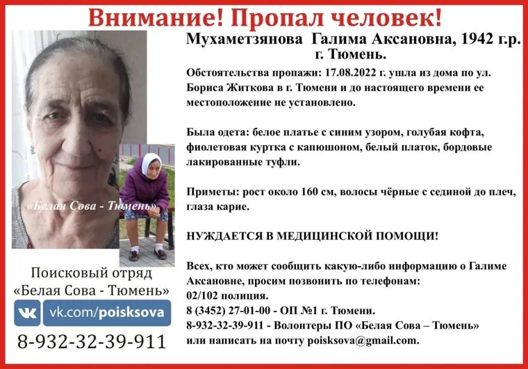 «Пропал человек! Мухаметзянова Галима Аксановна, 1942 года рождения. 17 августа 2022 года ушла из дома по улице Бориса Житкова и до настоящего времени ее местоположение не установлено», — говорится в сообщении поисковиков. Отмечается, что пенсионерка нуждается в медицинской помощи.