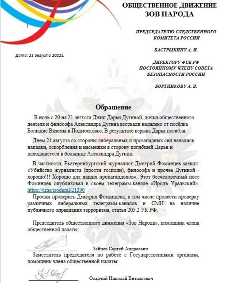 «Со стороны либеральных и прозападных сил начались нападки, оскорбления и насмешки в сторону погибшей Дарьи и находящегося в больнице Александра Дугина. В частности, журналист Дмитрий Фоминцев заявил, что „убийство журналиста (прости господи), философа и прочее Дугиной — хорошо для наших пропагандонов“. Просим проверить Фоминцева, в том числе, провести проверку различных либеральных telegram-каналов и СМИ на наличие публичного оправдания терроризма», — говорится в обращении общественников.