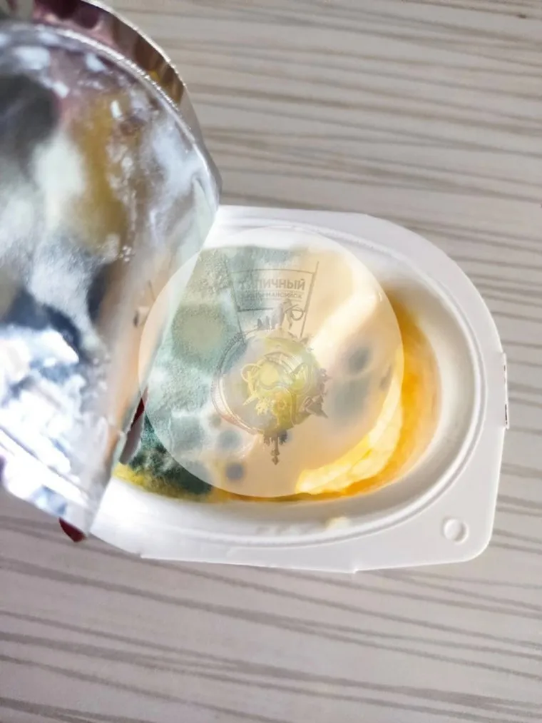 «Купила вчера в „Магните“ йогурт. Один нормальный был, второй решила сегодня съесть. И вот „красота“. Либо сроки годности перебиты, либо условия хранения нарушены. Других объяснений у меня нету», — написала пользователь Татьяна Олейник, прикрепив фотографию йогурта с плесенью.