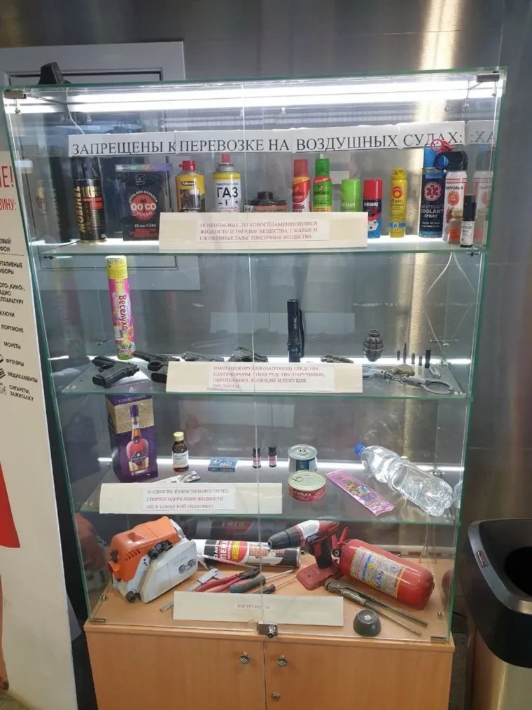 В тюменском аэропорту Рощино установили стенд с вещами, запрещенными к проносу на борт самолета. Об этом сообщили горожане в паблике «ЧС Тюмень» в соцсети «ВКонтакте». Среди прочих примеров служба аэропорта предупредила, что к проносу запрещены гранаты и противопехотные мины «Лепесток».