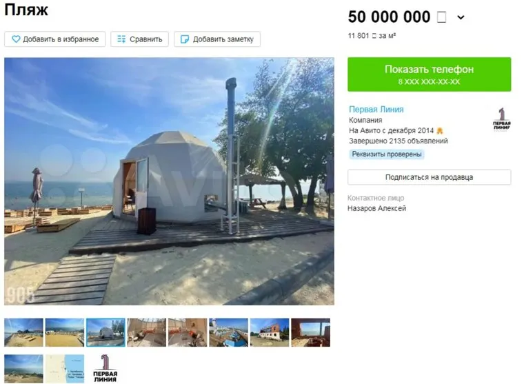 «В состав пляжного комплекса входит земельный участок площадью 4267 квадратных метров с белым песком. Есть глэмпинг, шезлонги, бар и кухня, сап-борды, терасса из лиственницы», — говорится в объявлении на сайте «Авито».